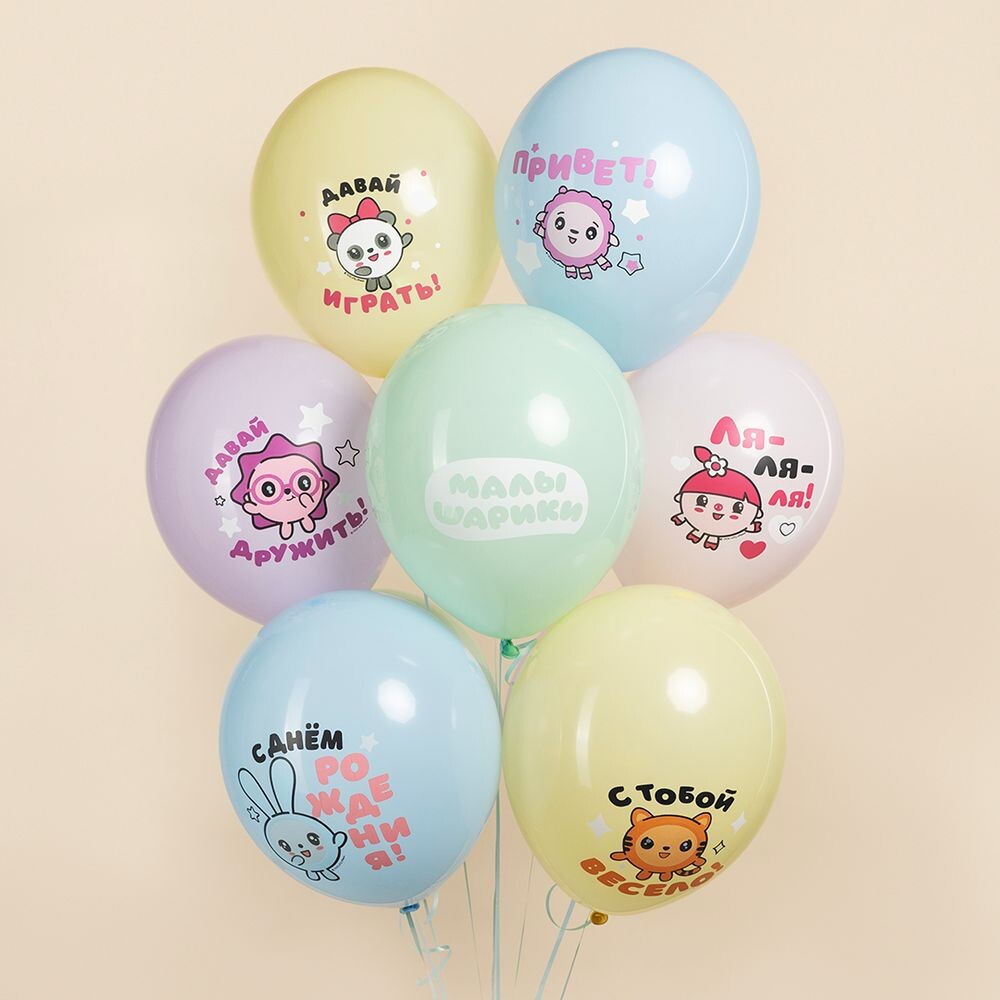 1. ≈ 12'' / 30 см, Шар с рисунком, Малышарики, С Днем Рождения!, Пастель с обработкой - 9 шт;