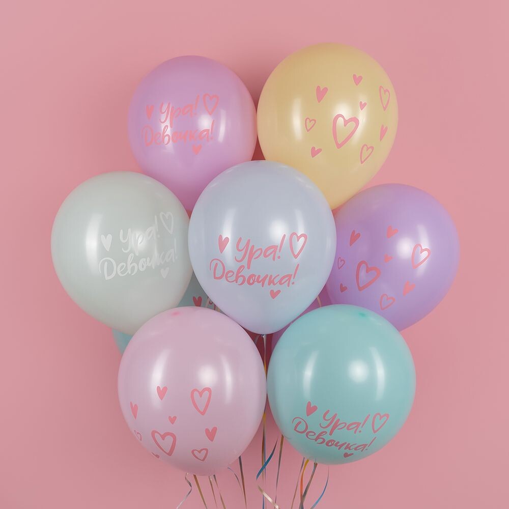 1. ≈ 12'' / 30 см, Шар с рисунком, На выписку, Ура, Девочка!, Ассорти, Пастель с обработкой - 10 шт;